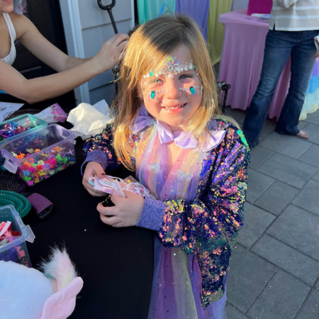 We bring a makeup station where the princess applies face jewels, rainbow eyeshadow and lipstick, of course, leaving guests sparkling like royalty. Kids can also enjoy coloring pages at a creative station, or simply hang out with the princess and unicorn.