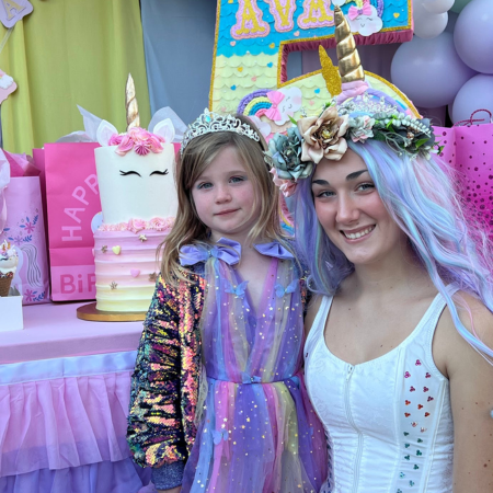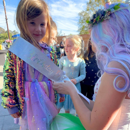 The birthday child will be crowned with a sparkling tiara and draped with a birthday sash during a special ceremony. Our princess will also present a thoughtful gift for the guest of honor and distribute unicorn-themed favors, like headbands or trinkets, to every guest.